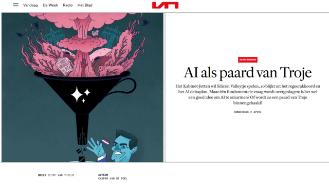 “Het Kabinet-Jetten wil Silicon Valleytje spelen, blijkt uit het regeerakkoord en het AI deltaplan. Maar één fundamentele vraag wordt overgeslagen: is het wel een goed idee om AI te omarmen? Of wordt zo een paard van Troje binnengehaald?”. Samen met Felienne Hermans, Ilyaz Nasrullah, Marleen Stikker, Reijer Passchier, Bernard van Gastel en Claes de Vreese werd ik geïnterviewd door Caspar van de Poel voor Vrij Nederland. In het stuk reflecteren we kritisch op het regeerakkoord. Mijn belangrijkste punt: AI-adoptie zou nooit het vertrekpunt van beleid mogen zijn. Eerst moet de vraag worden gesteld welk probleem we willen oplossen en of AI daar überhaupt een geschikt middel voor is. Lees hier het volledige artikel. Lees hier onze eerdere open brief aan de politiek namens 700 wetenschappers, experts en maatschappelijke organisaties.